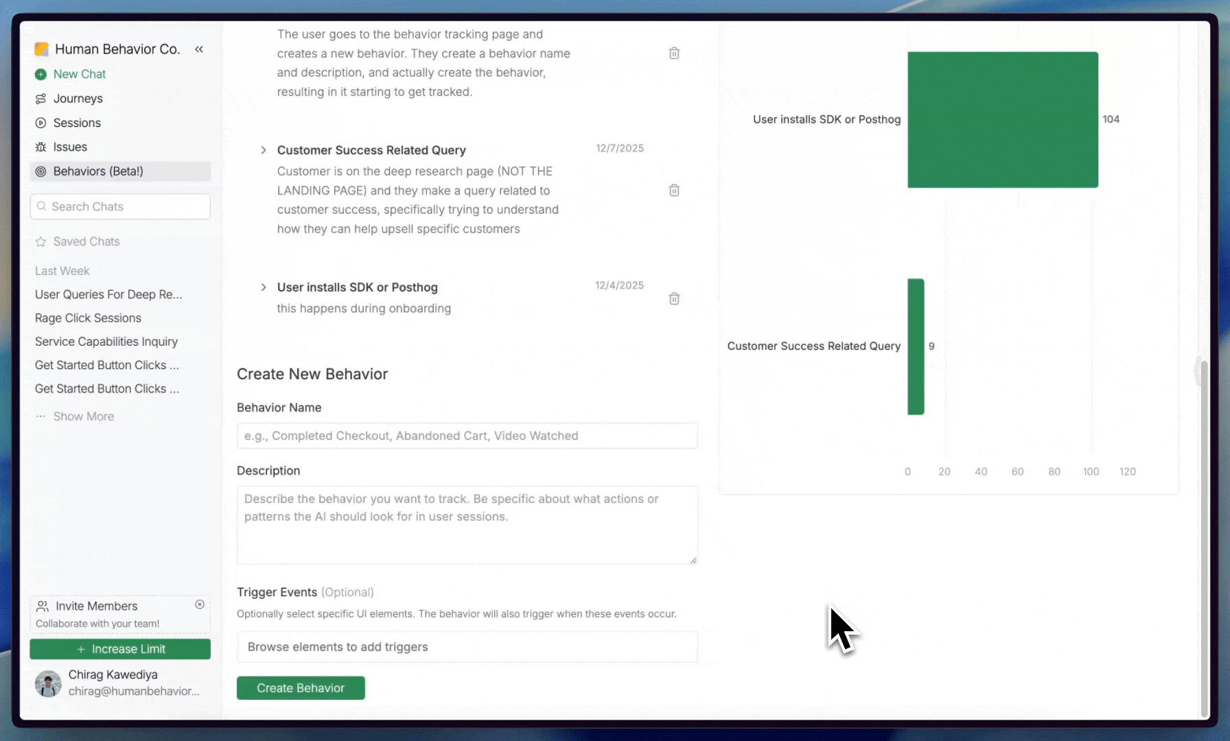 Because Human Behavior can watch every session with AI, it can track specific user behaviors which it observes, allowing you to quickly identify feature usage and quantify complex patterns without requiring granular event instrumentation. Simply navigate to the "Behaviors" page to see and manage behaviors.